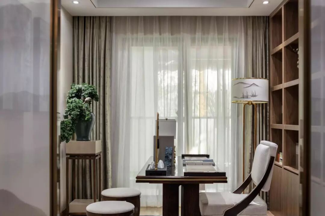 读书有物,古民今人无不推崇读书,案与椅相得益彰,翠翠青松为书房点睛,摊开的书籍自卷自舒,家私的比例高低在设计师的机心编排下,井然有序。