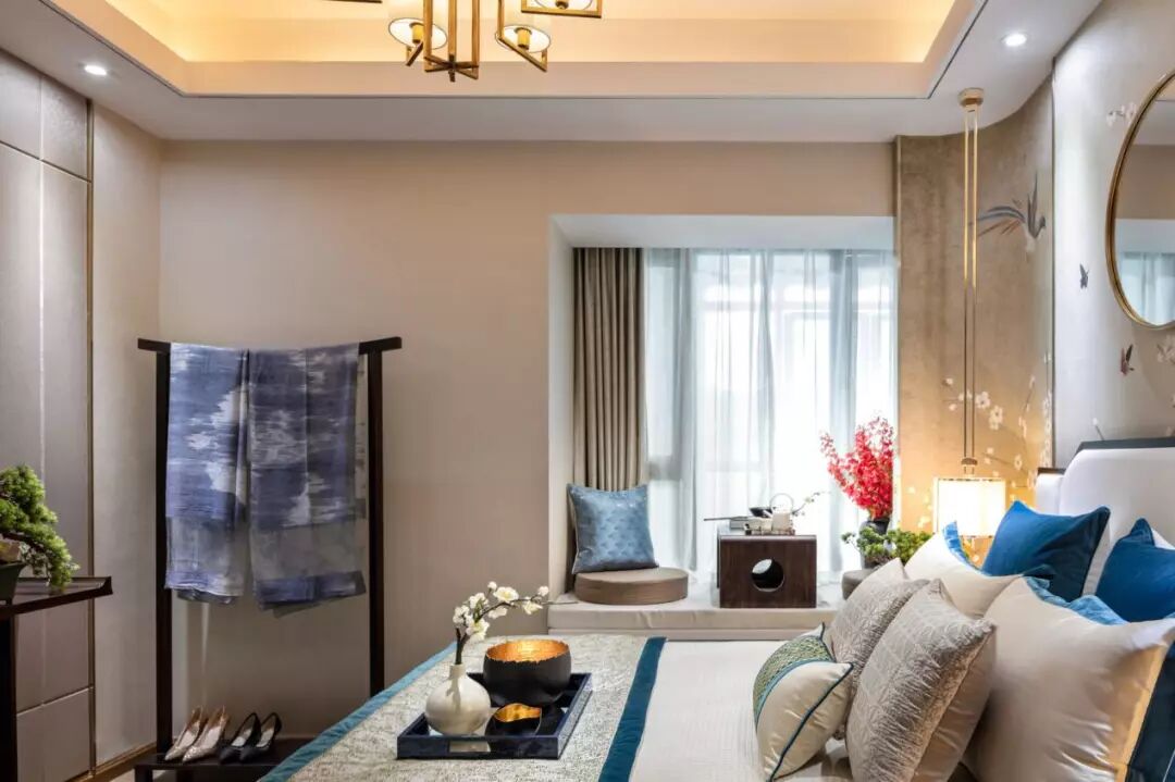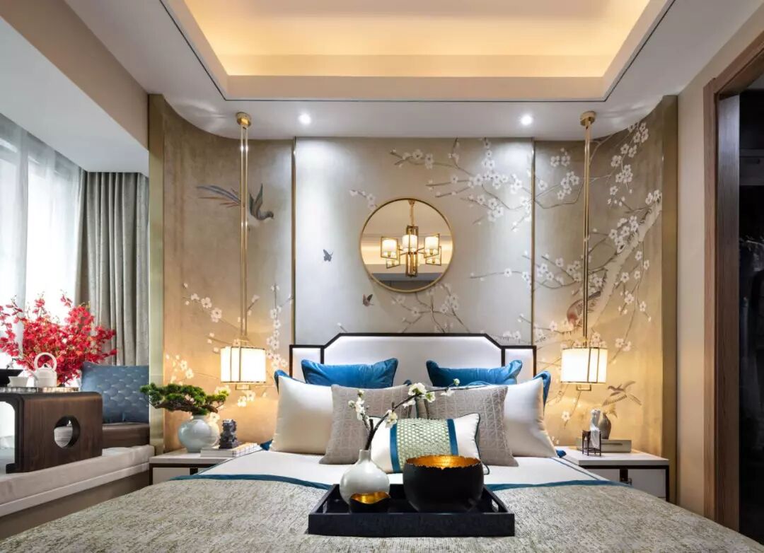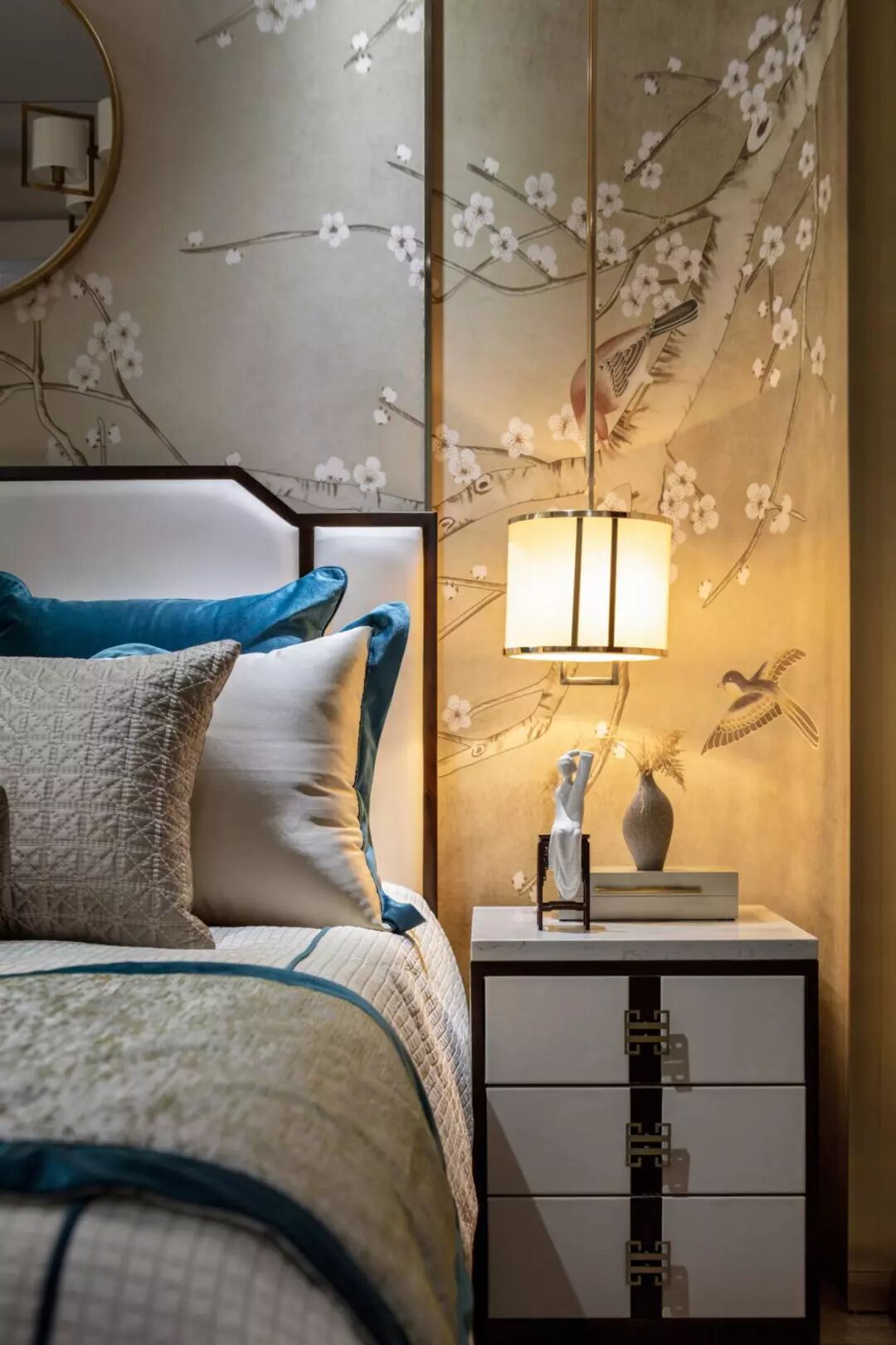 真丝层叠,锦缎央央,布艺用色雅致大方,又举一支芬芳,点缀红叶青松,安然自在。设计师大胆的在床头贴上一面圆镜,圆镜又将吊灯纳入画面,空间在光的传递中再次延伸。
