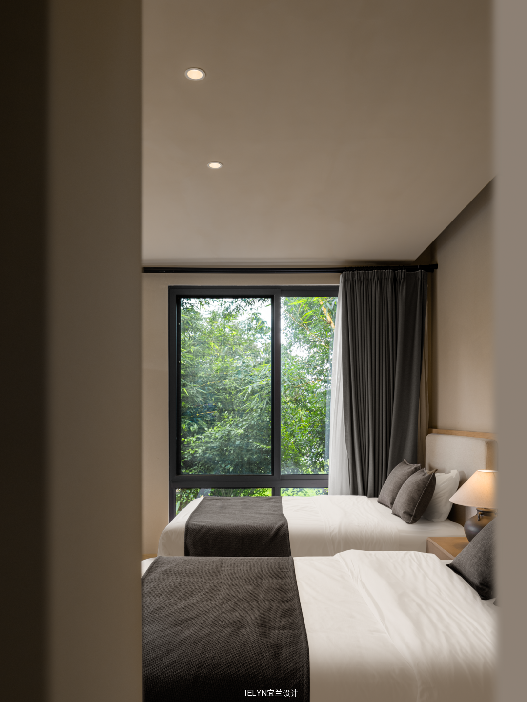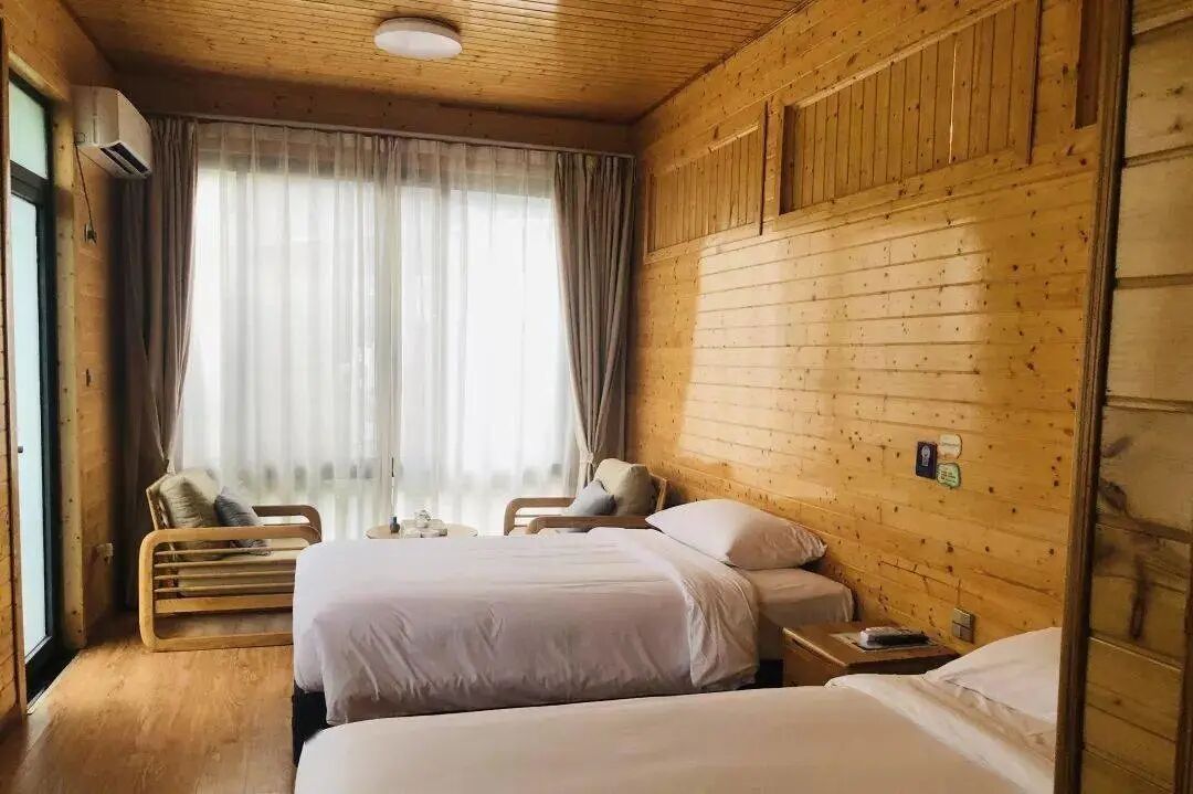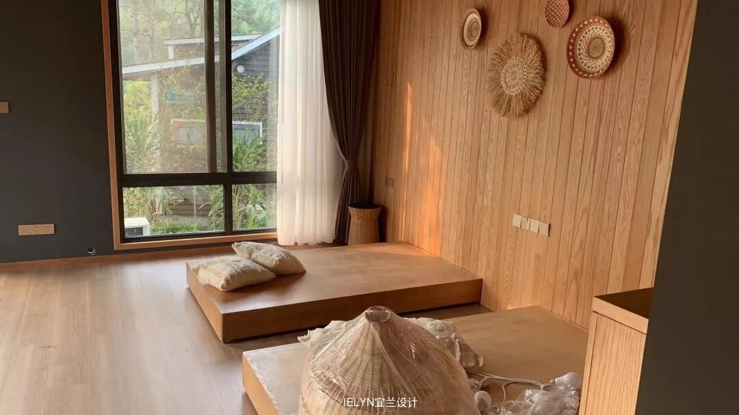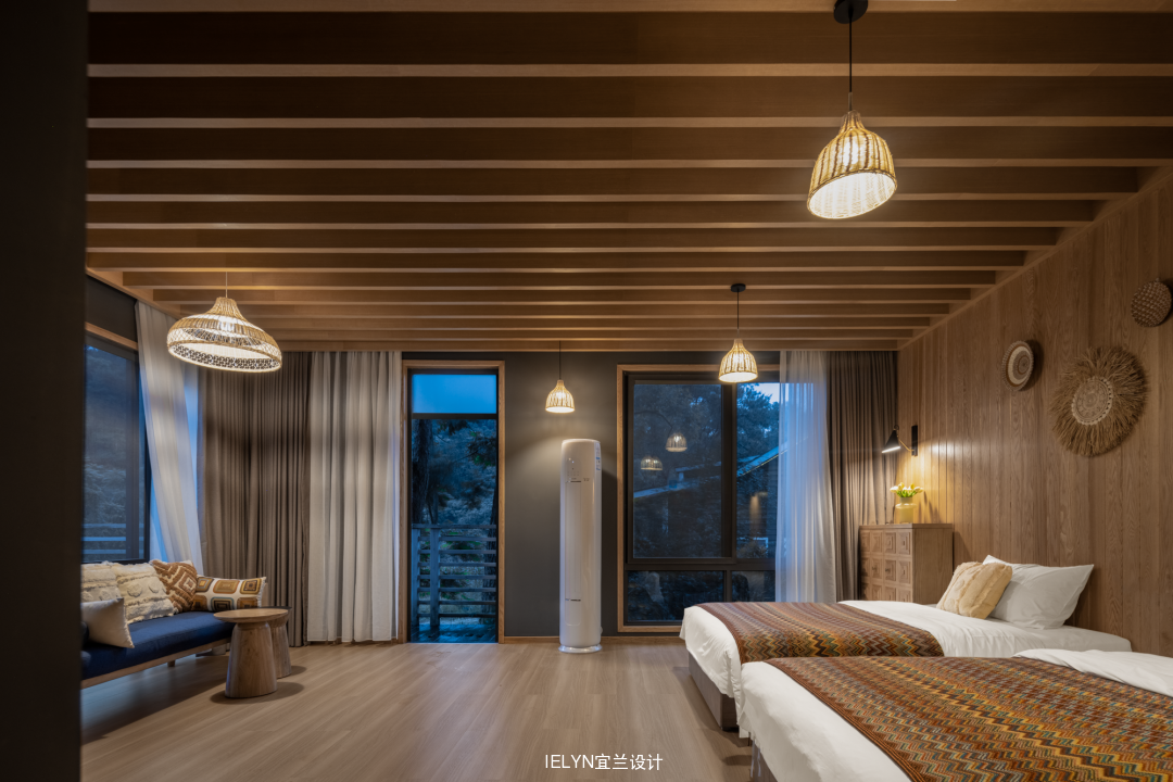 保留原始建筑的原木,合理地处理开窗开门,大落地玻璃窗的使用引入室外自然光线,内外虚实相交,融入民族元素和文化符号,增加很多可能性和趣味性,整体兼容舒适度和原始气质,呼应了无界的空间概念,应用可能性被进一步延展。