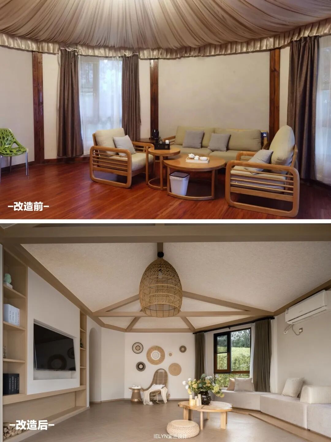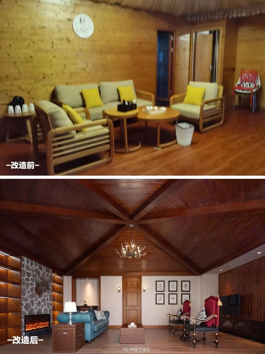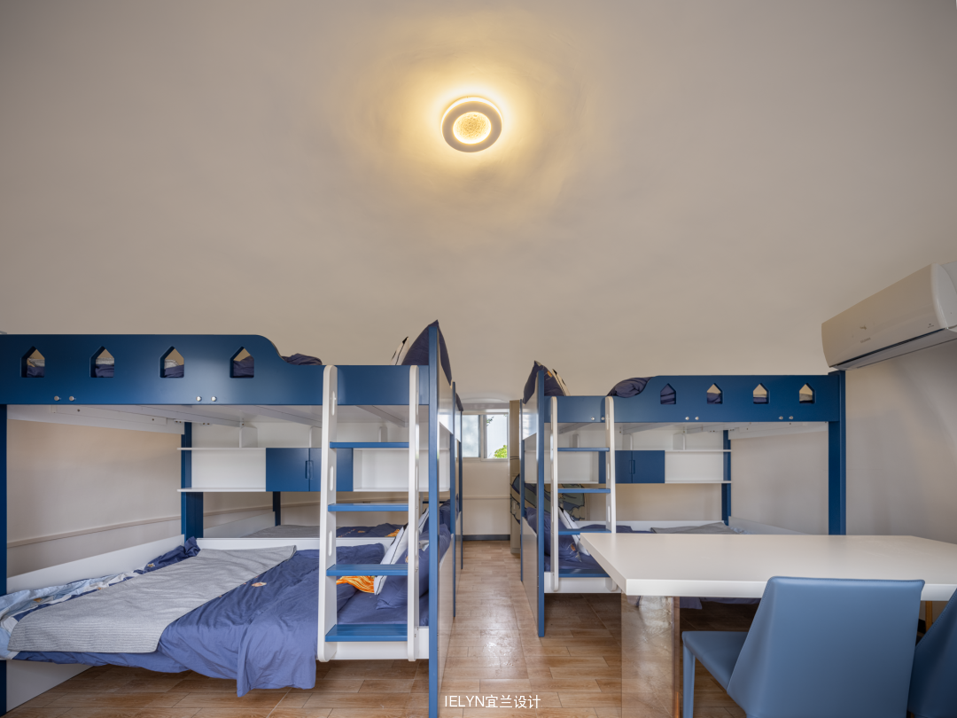 保留原始建筑的原木,合理地处理开窗开门,大落地玻璃窗的使用引入室外自然光线,内外虚实相交,融入民族元素和文化符号,增加很多可能性和趣味性,整体兼容舒适度和原始气质,呼应了无界的空间概念,应用可能性被进一步延展。