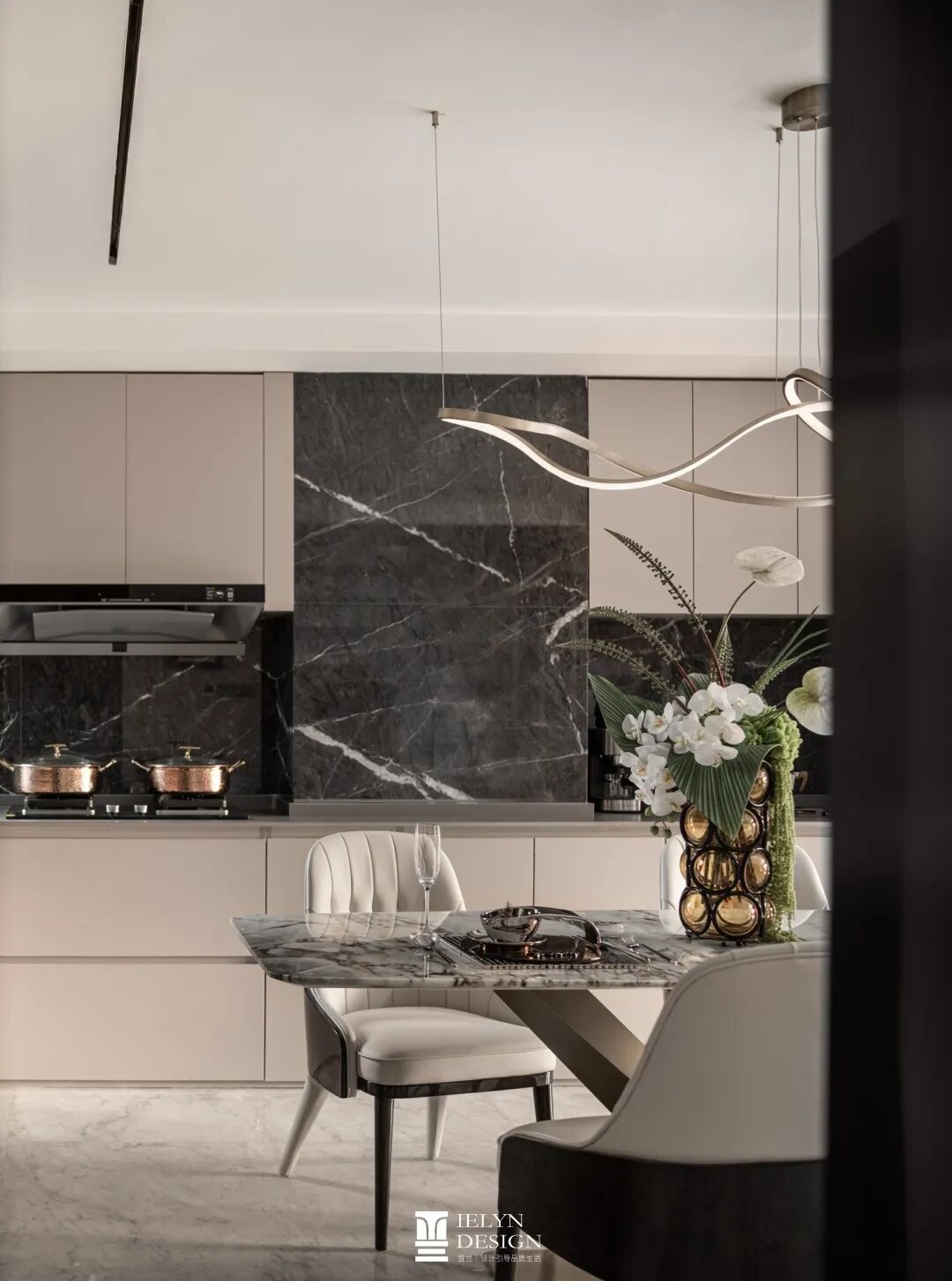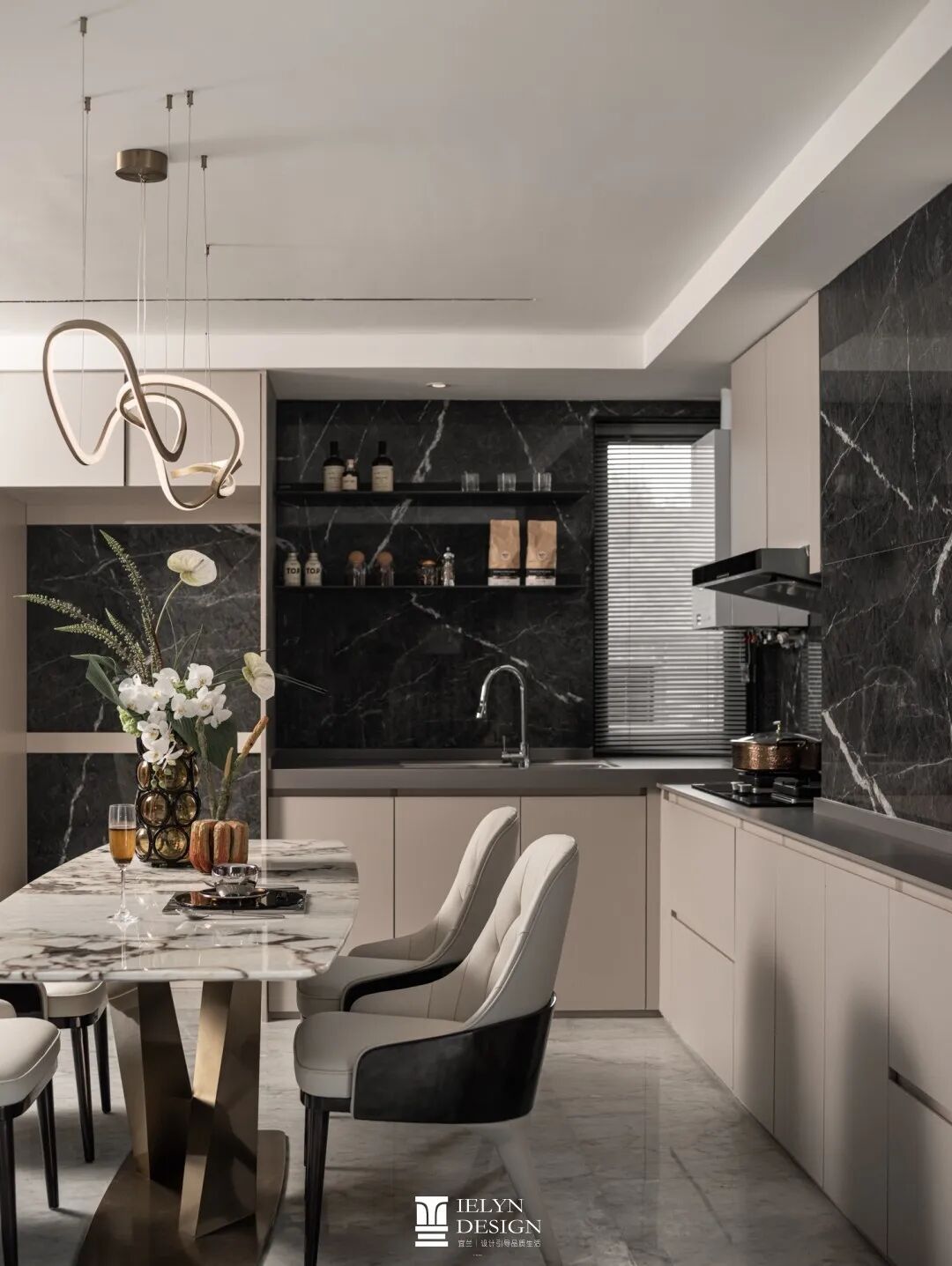 餐厅空间的设计追求简洁而雅致,将餐厅与厨房放置在一起,去除多余的装饰和繁琐的元素,保留最基本的、最纯粹的部分,不被繁杂的细节所拘束。