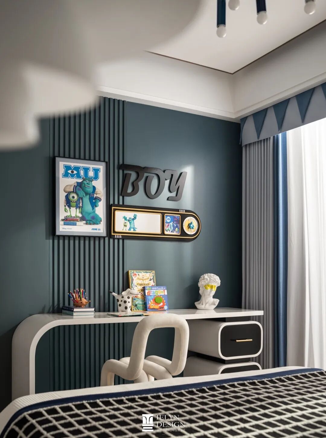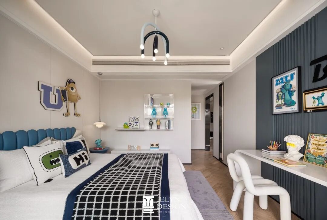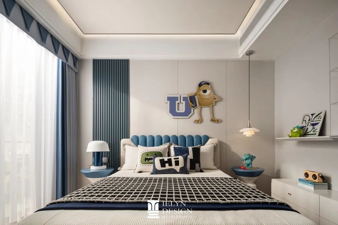 儿童男孩房,运用男孩子喜欢的主题“毛怪与大眼仔”,激发其对世界的想象。空间利率高,集休闲,学习,收纳各个功能区,呈现出无尽的俏皮感,活力感。