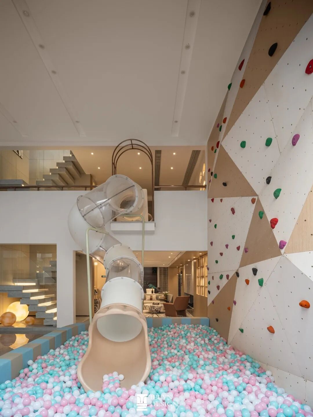 儿童娱乐玩耍区,将空间合理划分,把对孩子的爱,在生活的细节末节中给予支持。滑滑梯下面也做了海洋球堆,让孩子可以尽情玩耍。
