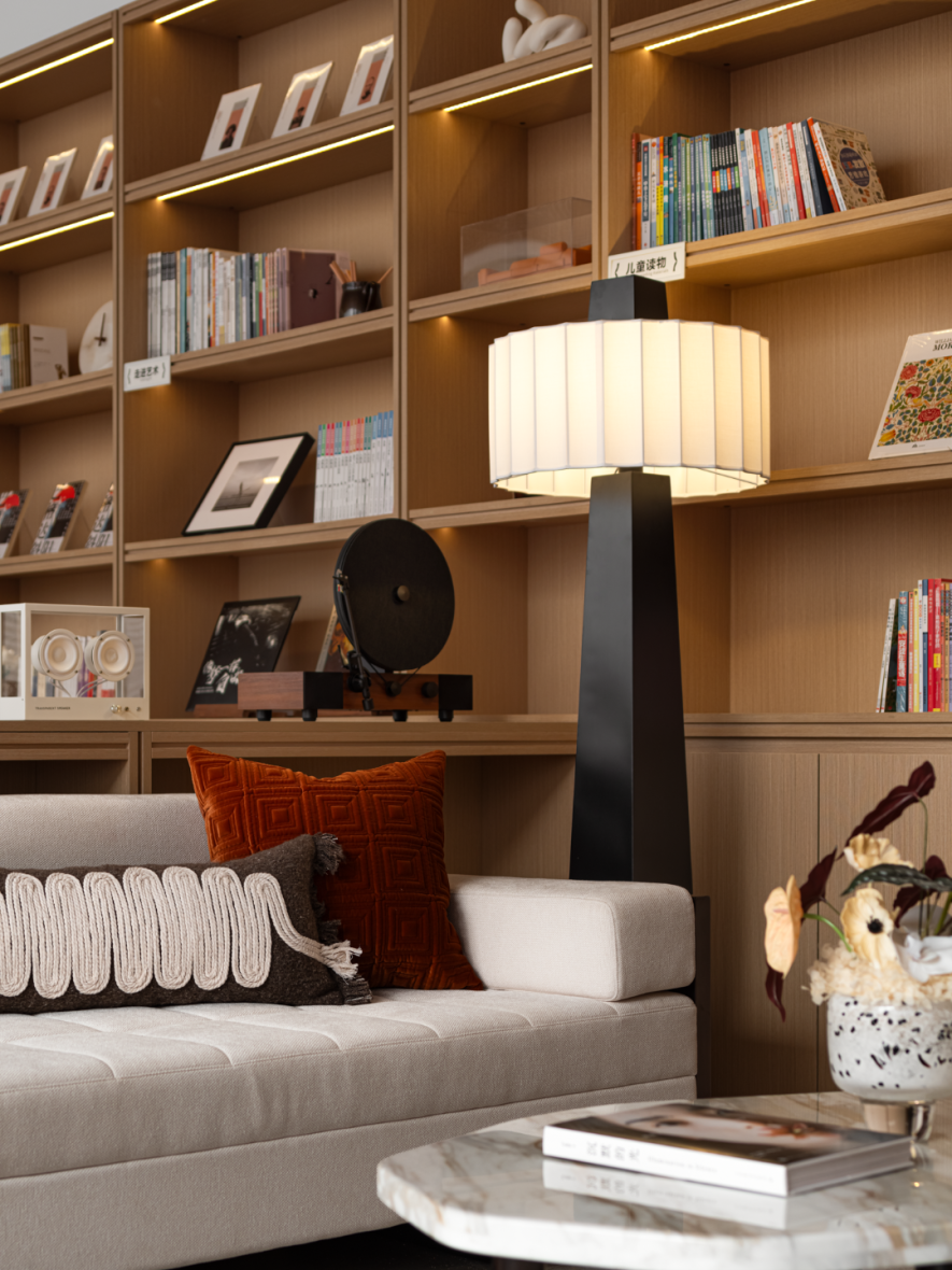 色彩选择上,追求内敛而深邃的色彩方案,通过木质的暖色调搭配和冷色调的点缀,营造一个既有学术氛围又不失轻松自然的阅读环境。