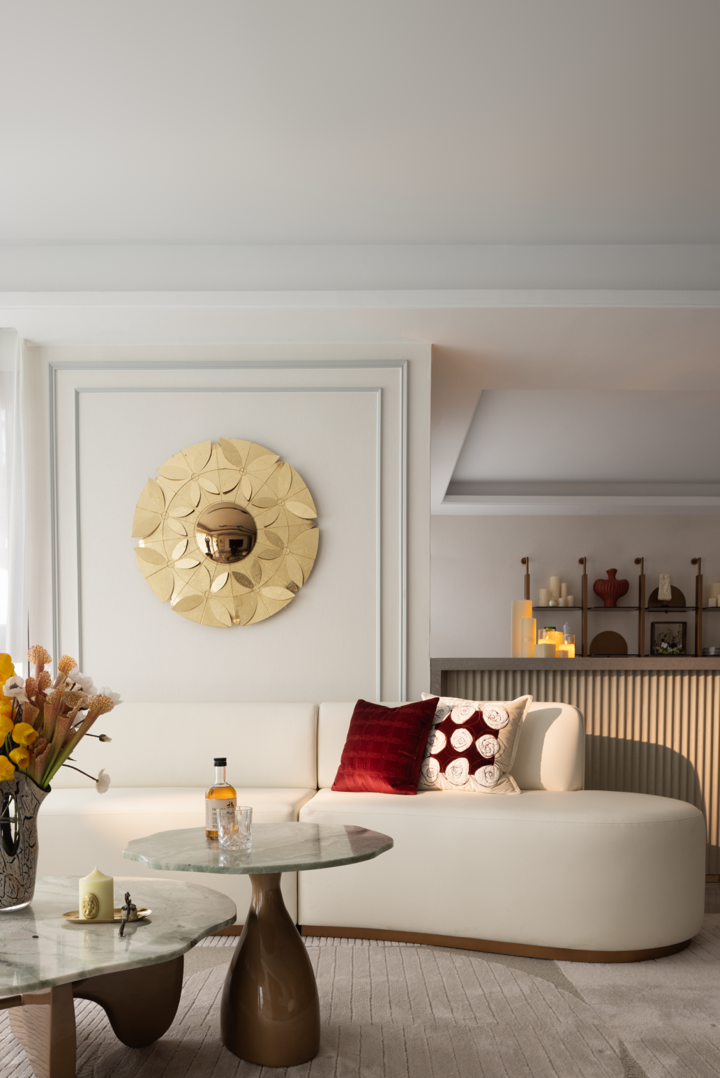 The space of this case is dominated by the gray and white color of everything, and the space mood infiltrates into the Burgundy red. The metal material collocation enriches the sense of space hierarchy, making the whole space have a French elegant luxury atmosphere。
