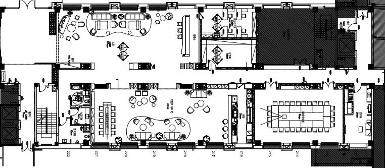 在功能分区上,一层是公共空间:有接待,茶吧及等候区,设计师整合背景墙、地毯与家私的色调,在同一旋律下转折变化。接待区由大理石与灯光切割出流畅线条,块毯划分,强调空间的分割使用。