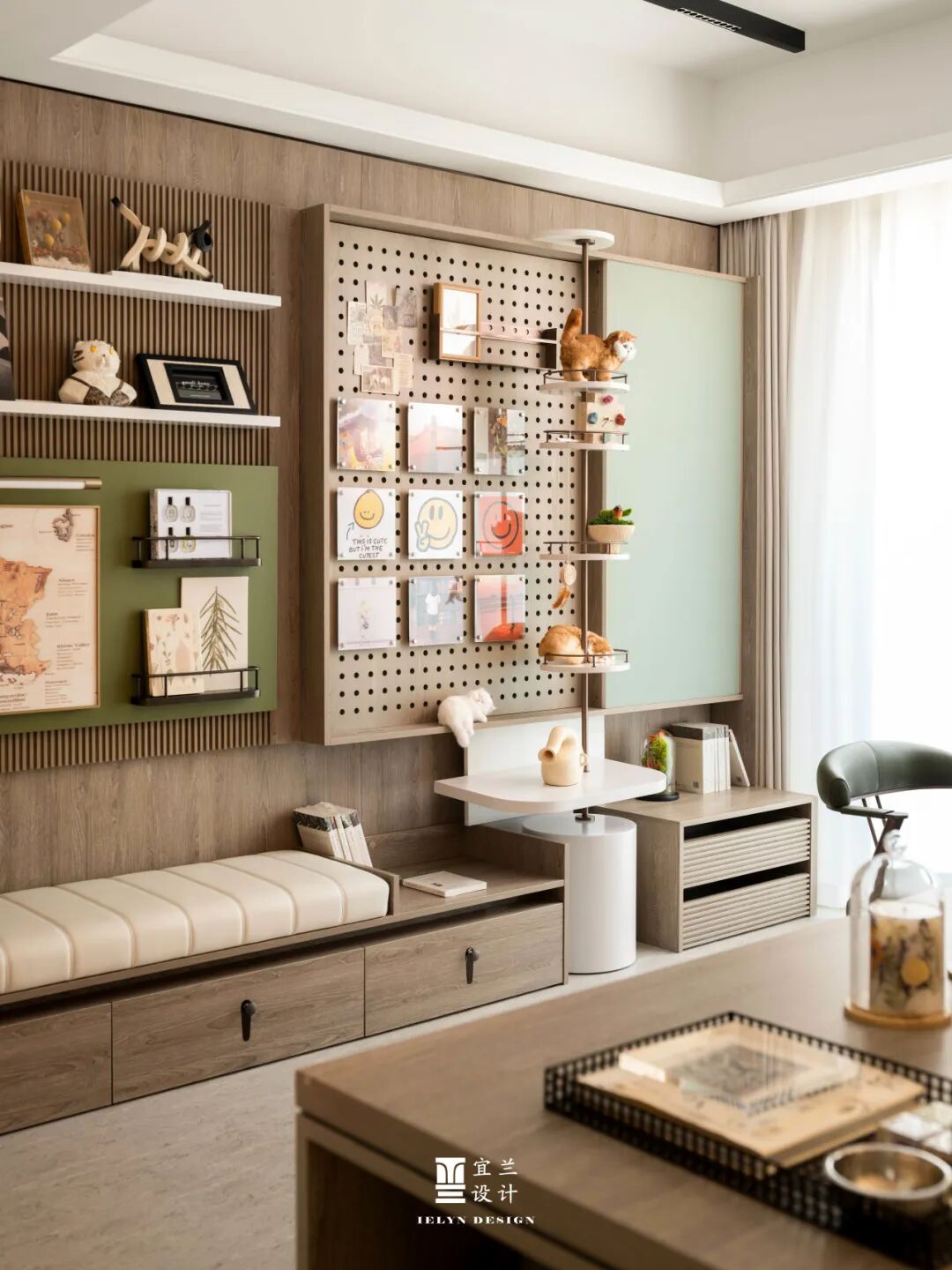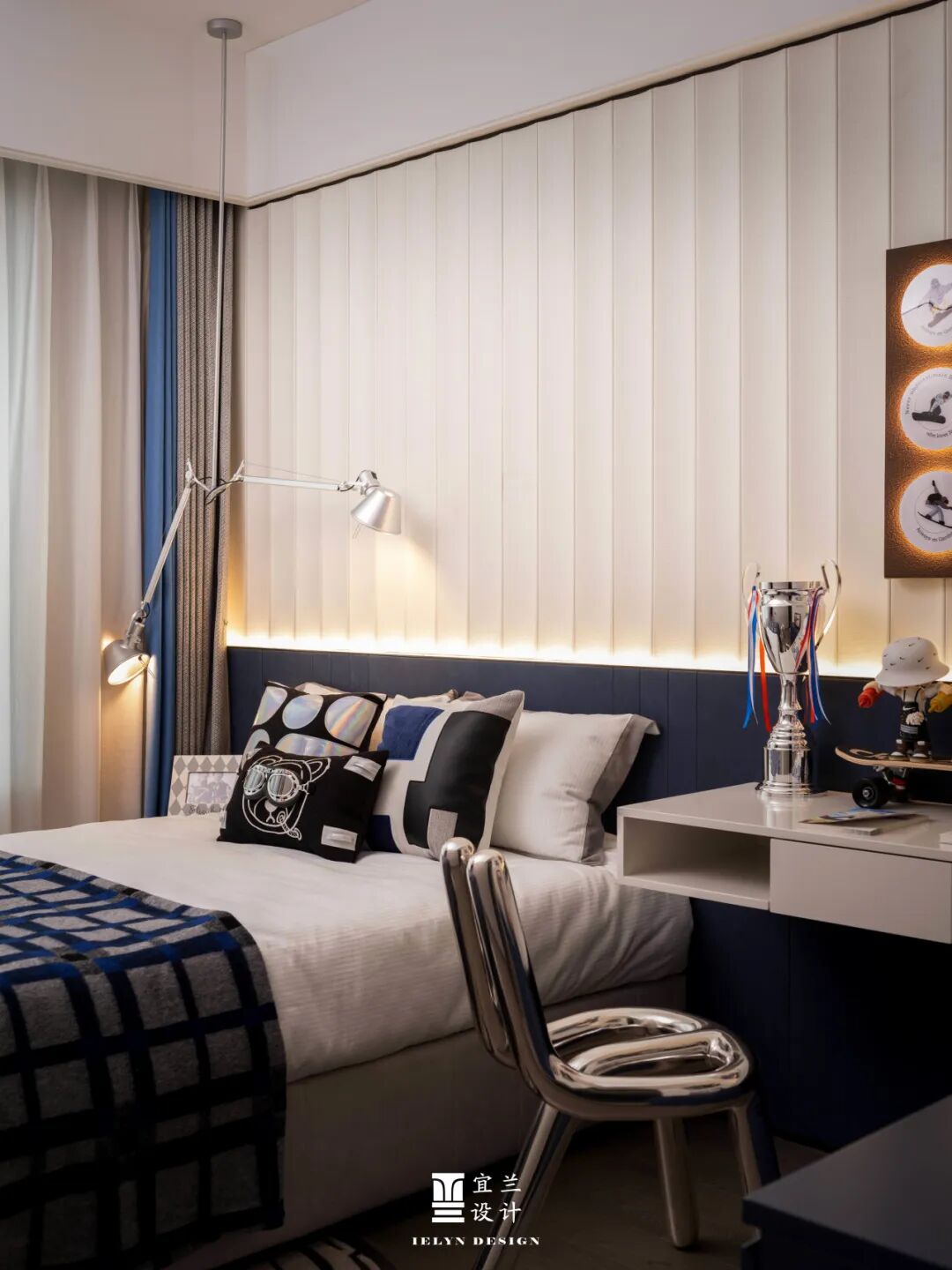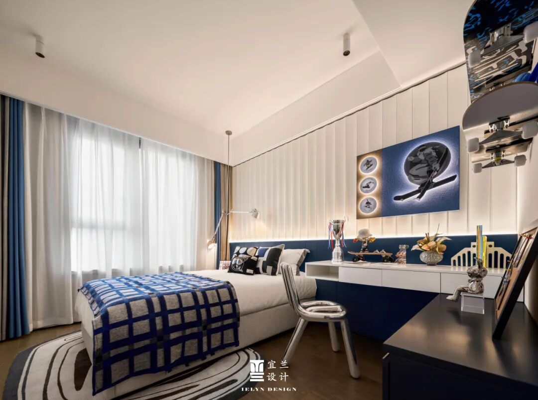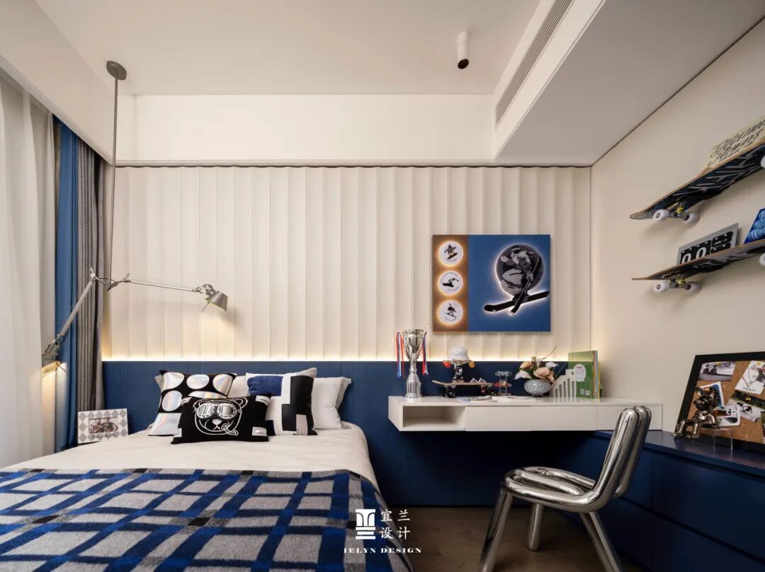 儿童房的设计充满了童趣和想象力。宜兰设计通过色彩的运用和玩具的摆放,为孩子们打造了一个充满梦幻和欢乐的空间。墙上的滑板装饰和书桌上的小摆 件, 为孩子们打造了一个梦想起航的童趣天地。