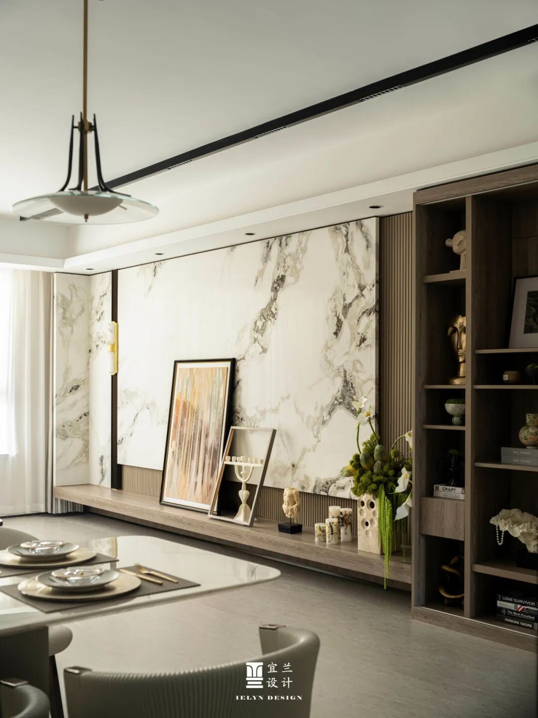 在这片空间中,光影是最初的语言。吊灯的柔和光线,与大理石墙面的冷峻交相辉映,营造出一种静谧而优雅的氛围。每一件装饰品,都是对生活品质的追求和对美的独特理解。