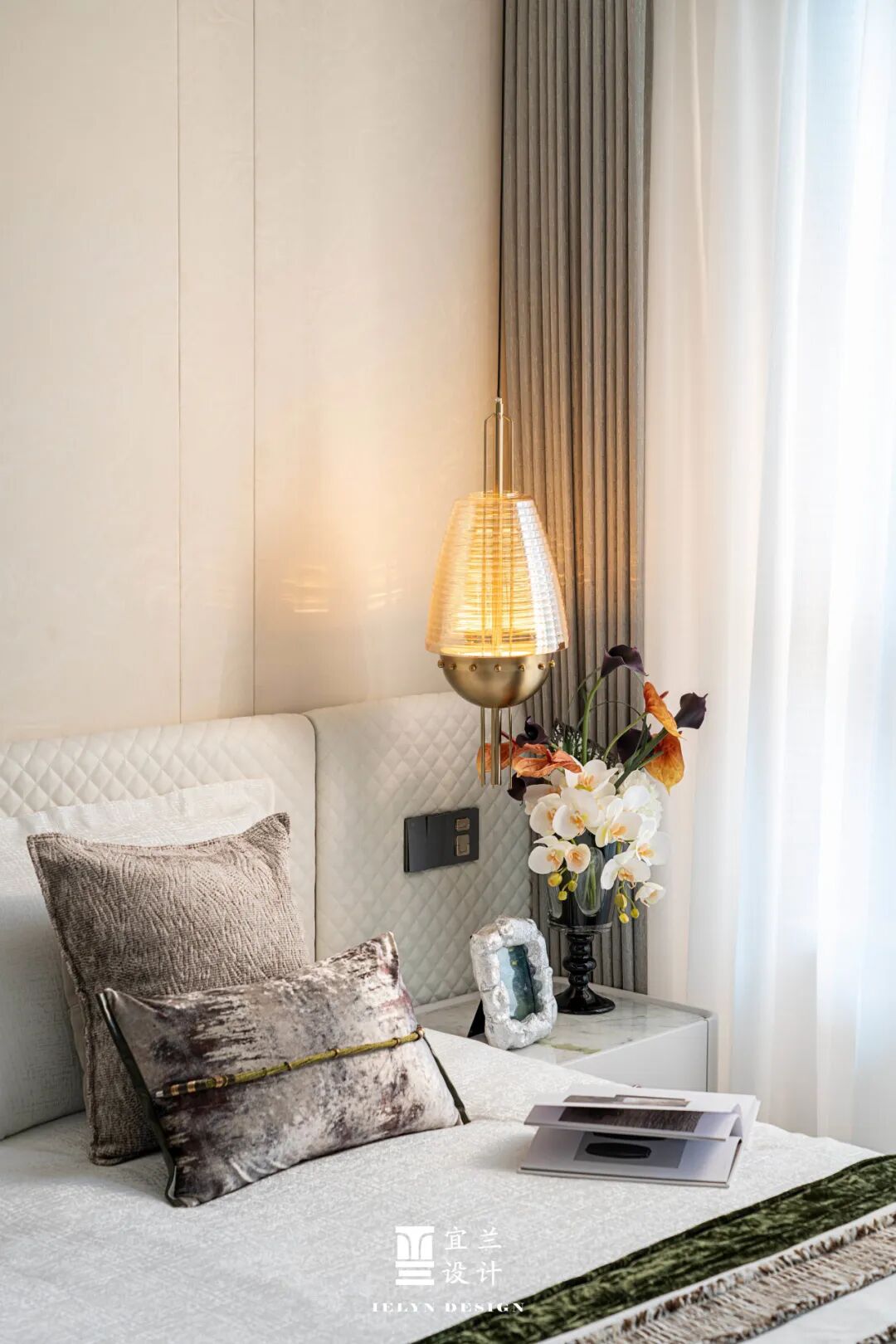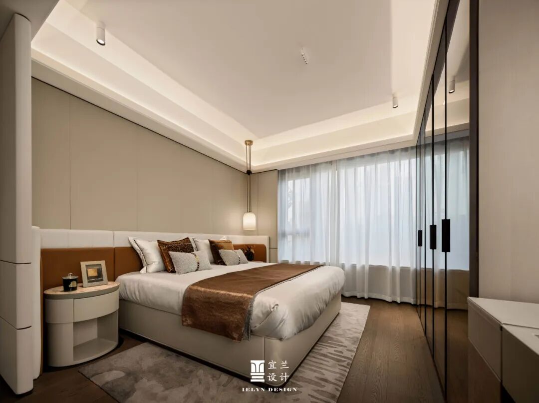 主卧的设计,宜兰以其细腻的笔触,描绘出一个静谧而舒适的休息空间。柔软的床品与温和的灯光,共同营造出一个放松身心的港湾。墙面的装饰与床品的图案相呼应,细节之处无不透露出设计的匠心。在这里,每一个夜晚都是一段温柔的守候。