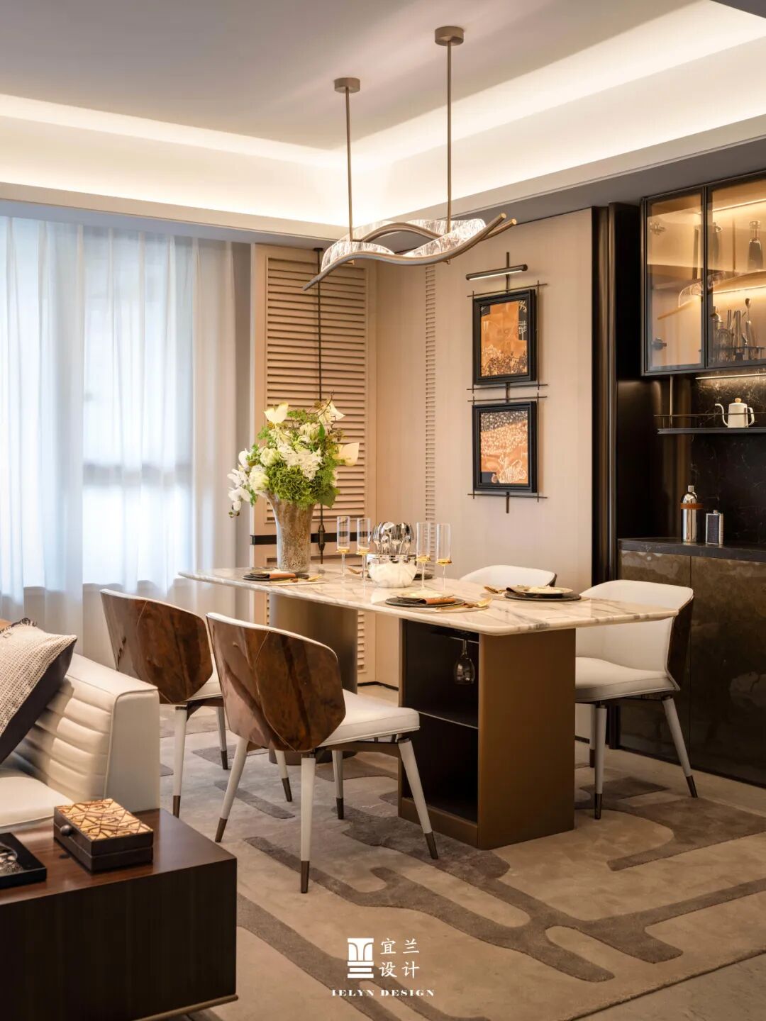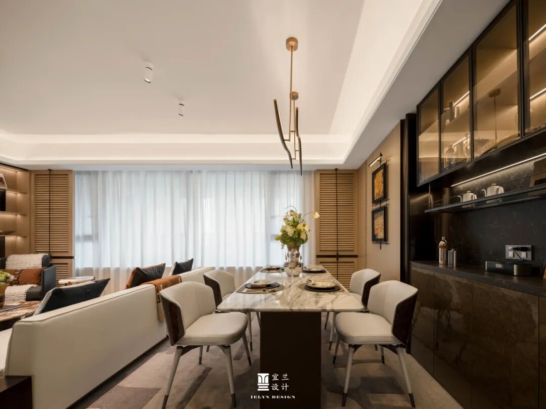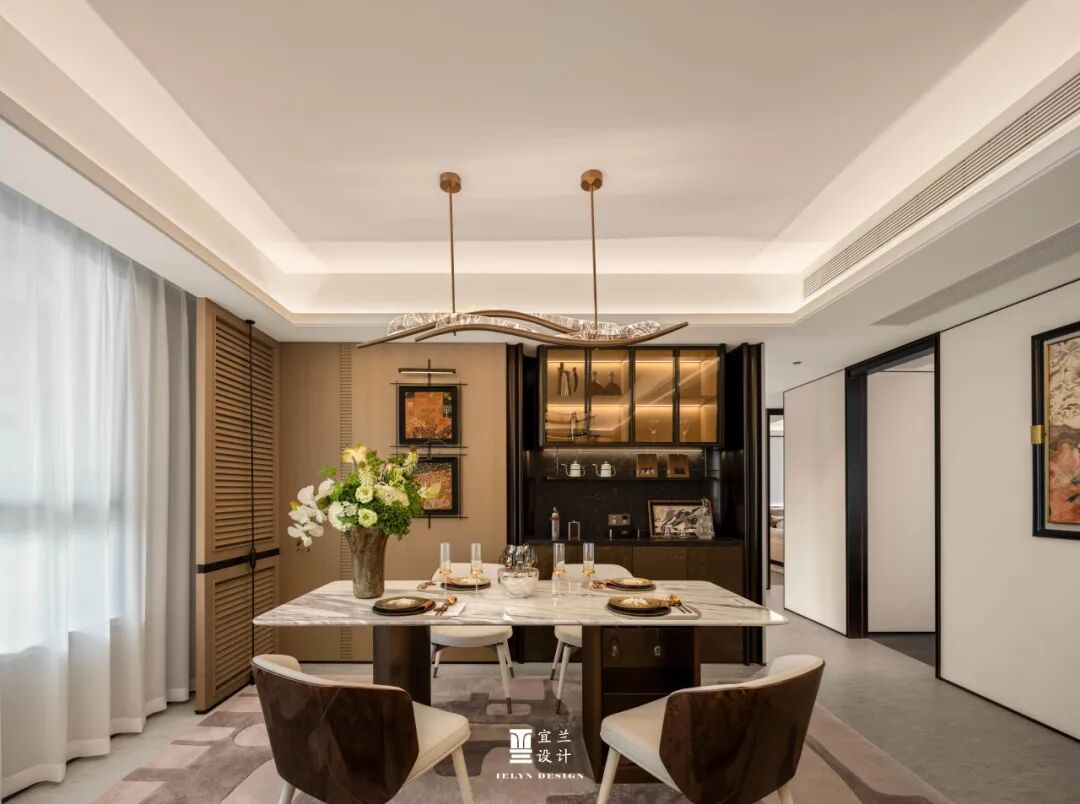 餐厅区域,是美食与情感的汇聚地。大理石餐桌与精致的餐具,不仅提升了用餐的仪式感,更在细节上展现了对生活品质的追求。吊灯的柔和光线,为每一次聚餐增添了温馨的氛围,让家的味道更加浓郁。