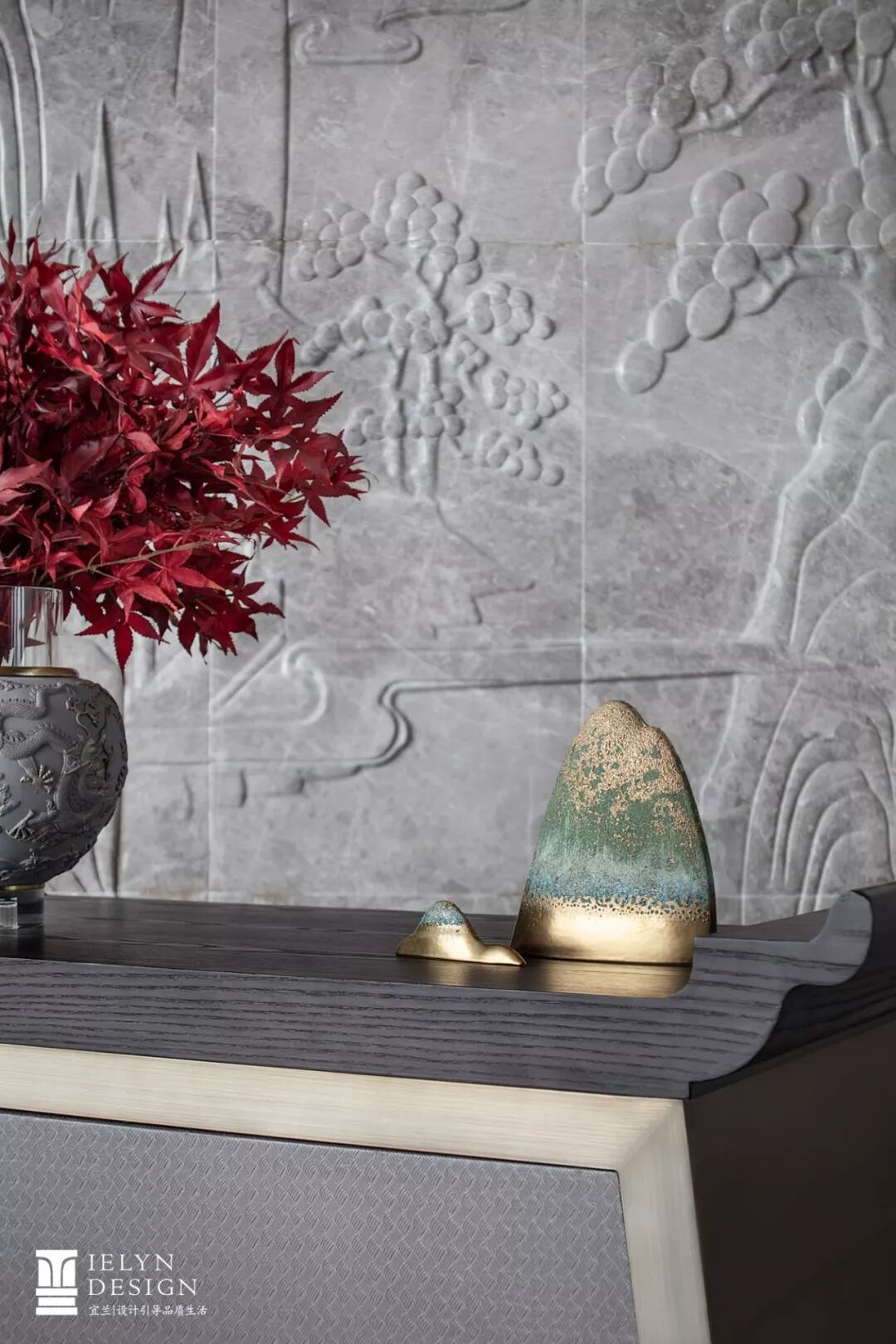 屏风飞鸟、石榴婆娑、木刻文章,每件物品形式都不尽相同,却在设计师的排布下含蓄赞誉临近的径河风光,将内外空间有机的联系到一起,用意境美表现具象美,以设计上的巧思展现项目优势。