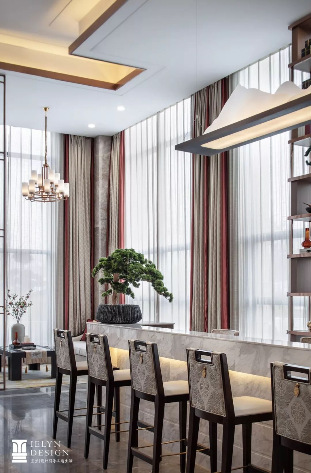设计师细心处理铜、铁、木材和大理石等材质的微妙关系,大理石的坚固与纤细高挑的吧椅进一步形成对比,吧椅背绣如意纹,吧台上方还有白山高挂,为空间带来柔而广的光环境。