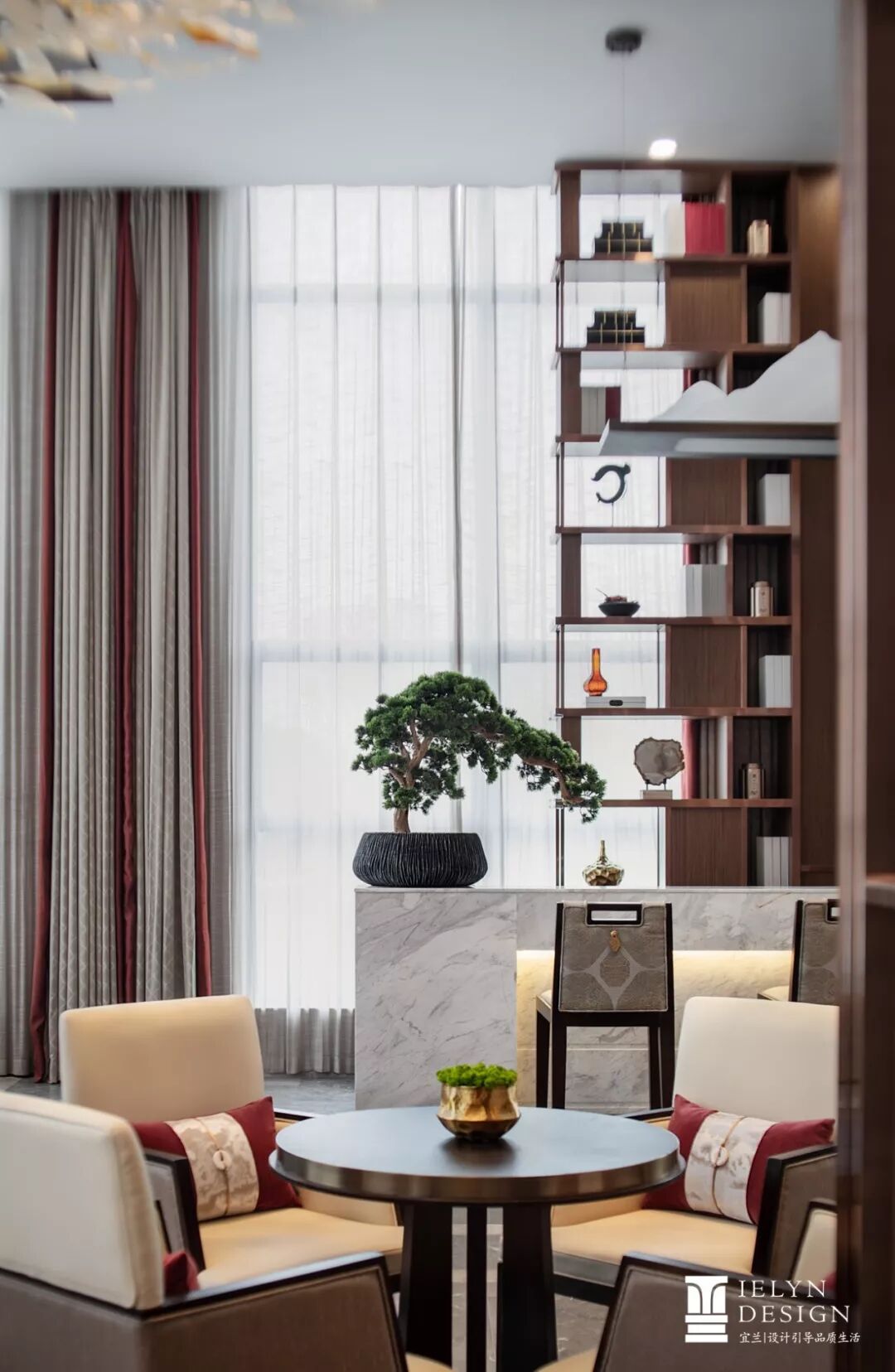 叶片灯饰下是一个个洽谈桌群组,素雅单椅点缀胭脂抱枕,在有序中出彩,环佩含光,锦绣山纹,一点绿芽从器皿里冒出头来,让局部的空间气息更加活跃。