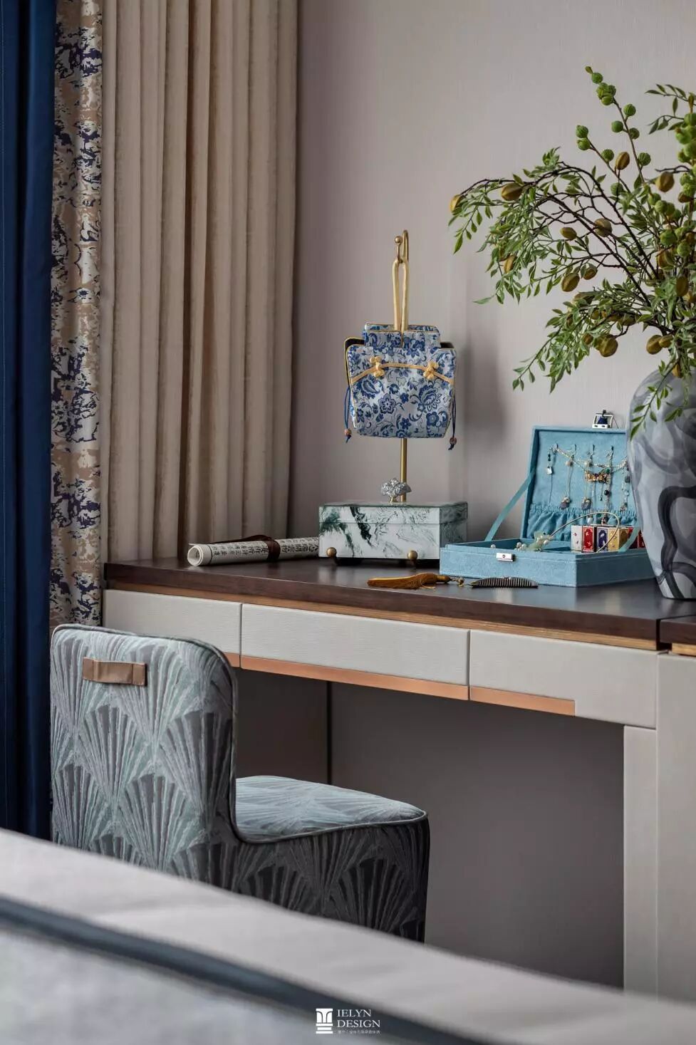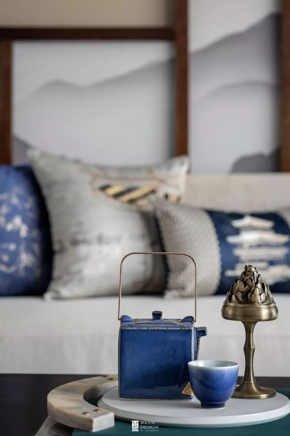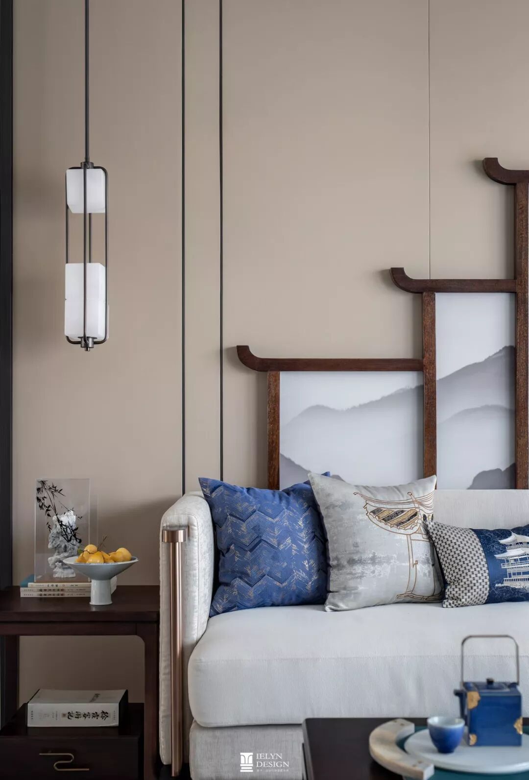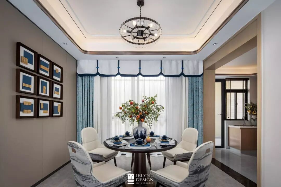 本案意让受众体验中式风雅。景 蓝与月白并行作为空间表示色,米、咖色系作底,深浅交替中拉开空间层次,主次分明。