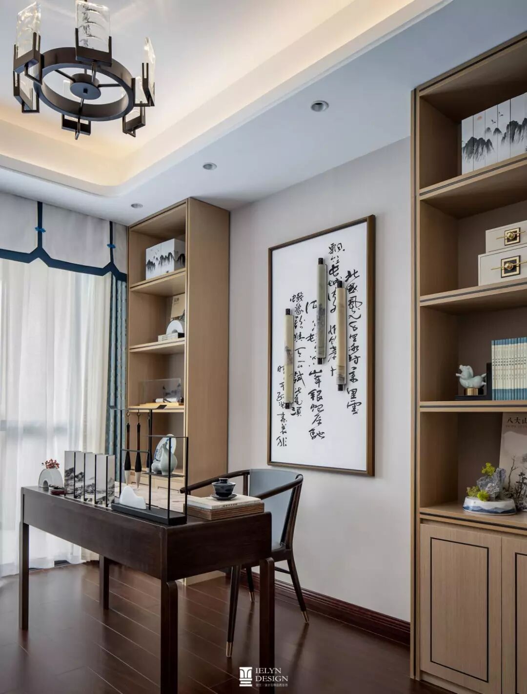 书房正中摆一张胡桃木书桌,形态方正,触感细腻,与圈椅作伴,大方奠定空间气质。画卷、藏书与前景呼应,书香渐浓,家风正起。