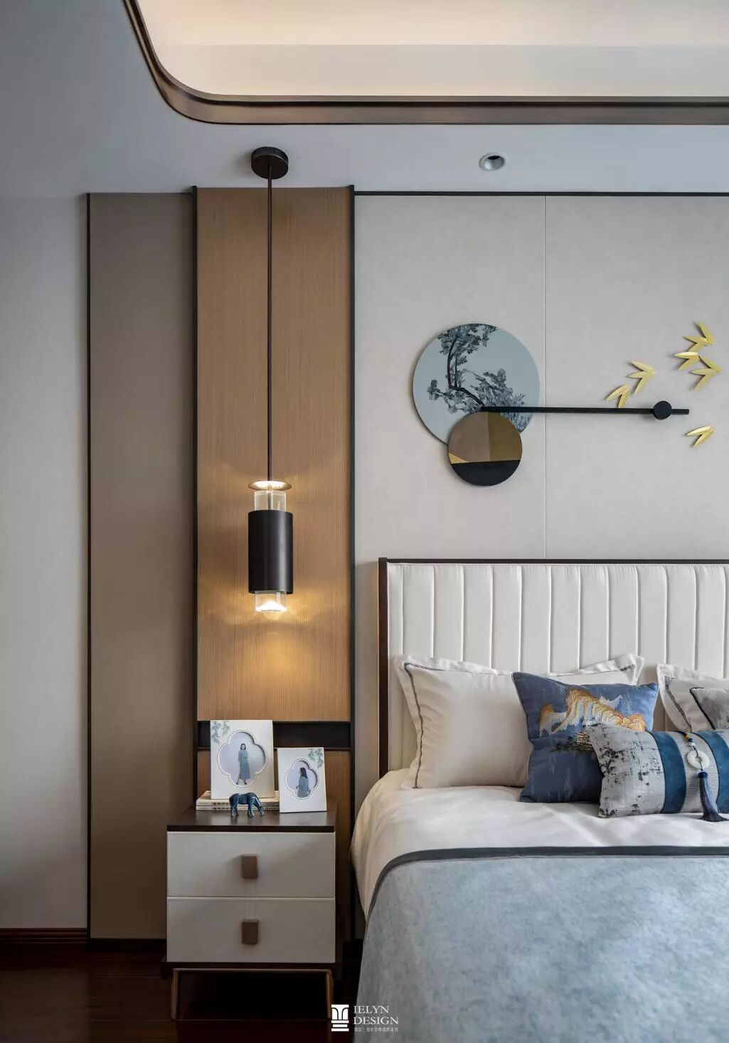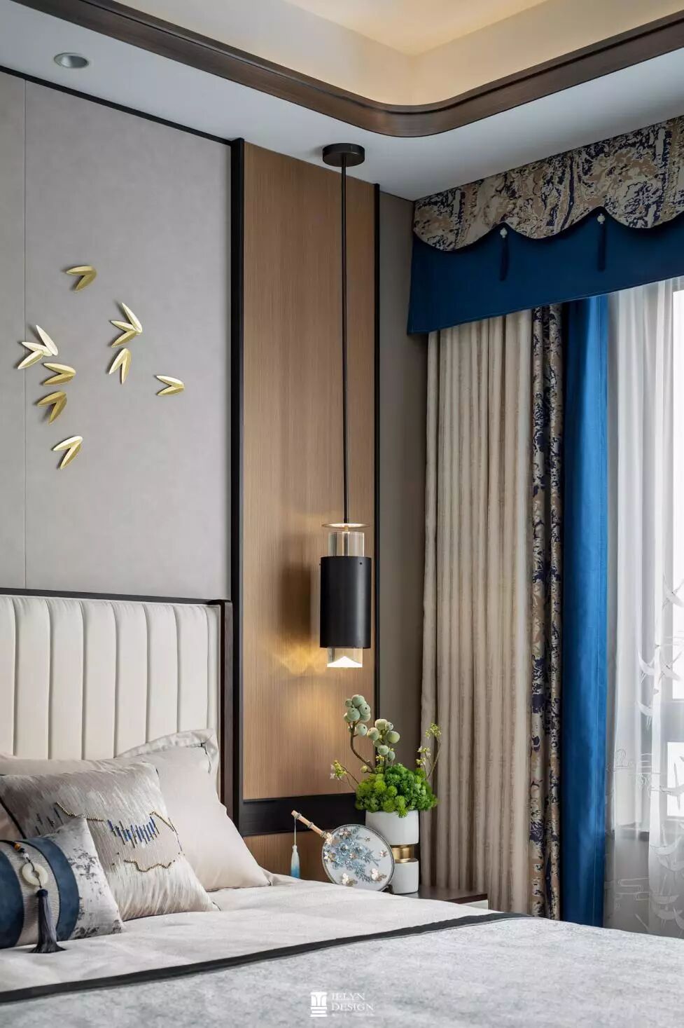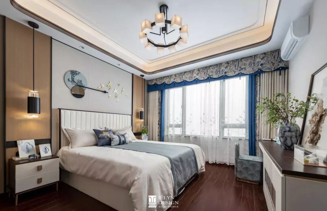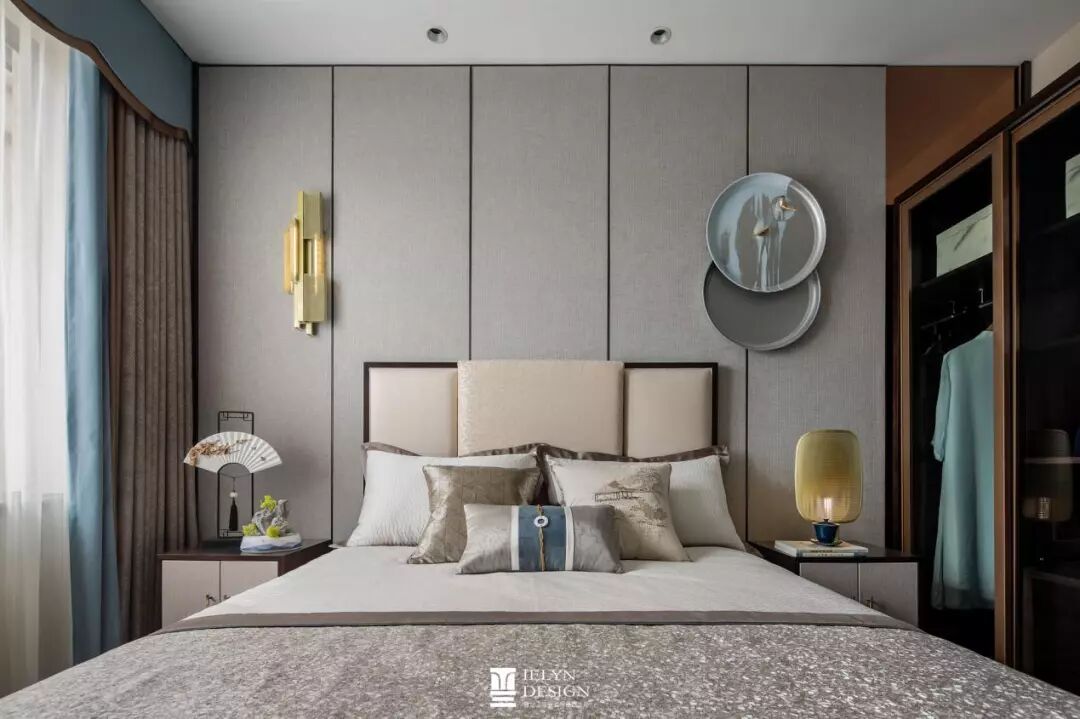 主卧设计中,有清幽淡雅,有蓝调沉静,都与趋近自然的木色和谐相容,各类小品摆设其中,相映成趣。 不同色彩与花纹相互交错融合,活泼而不繁杂。