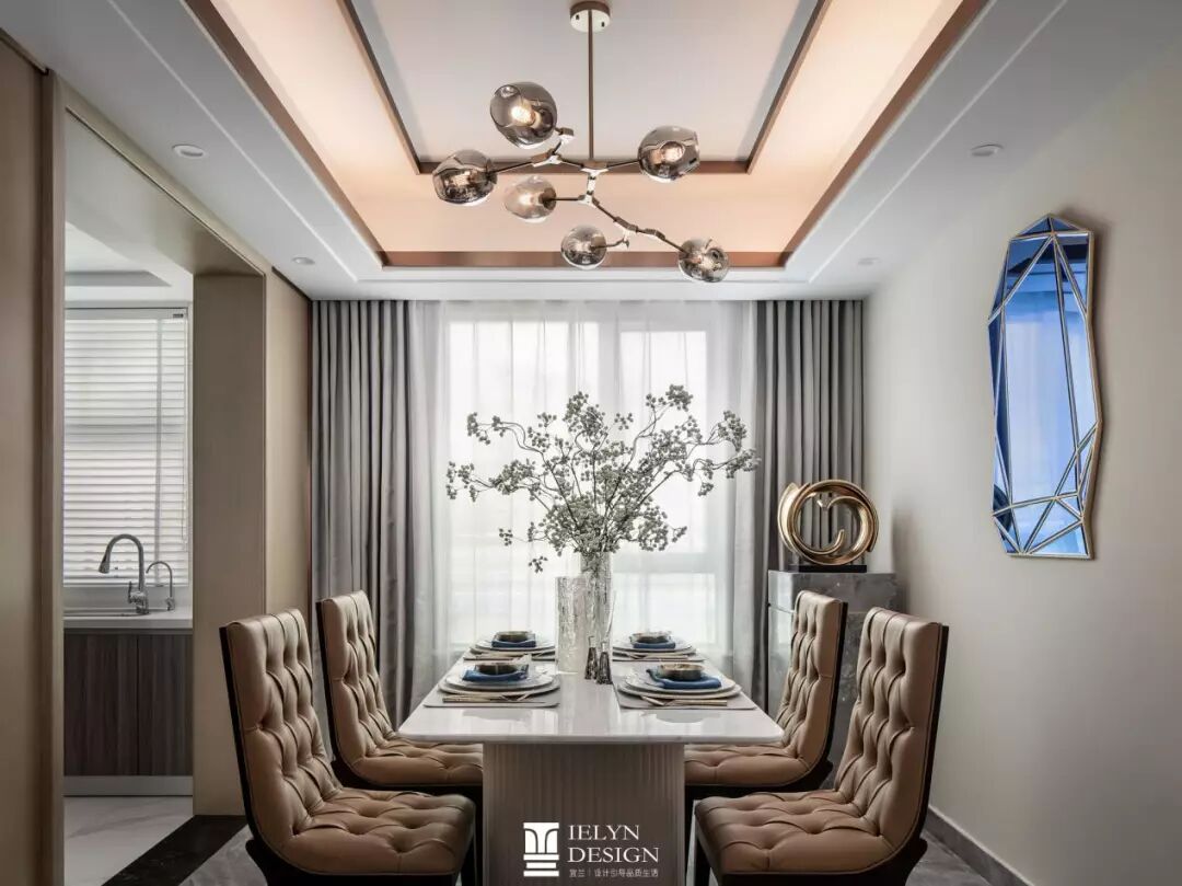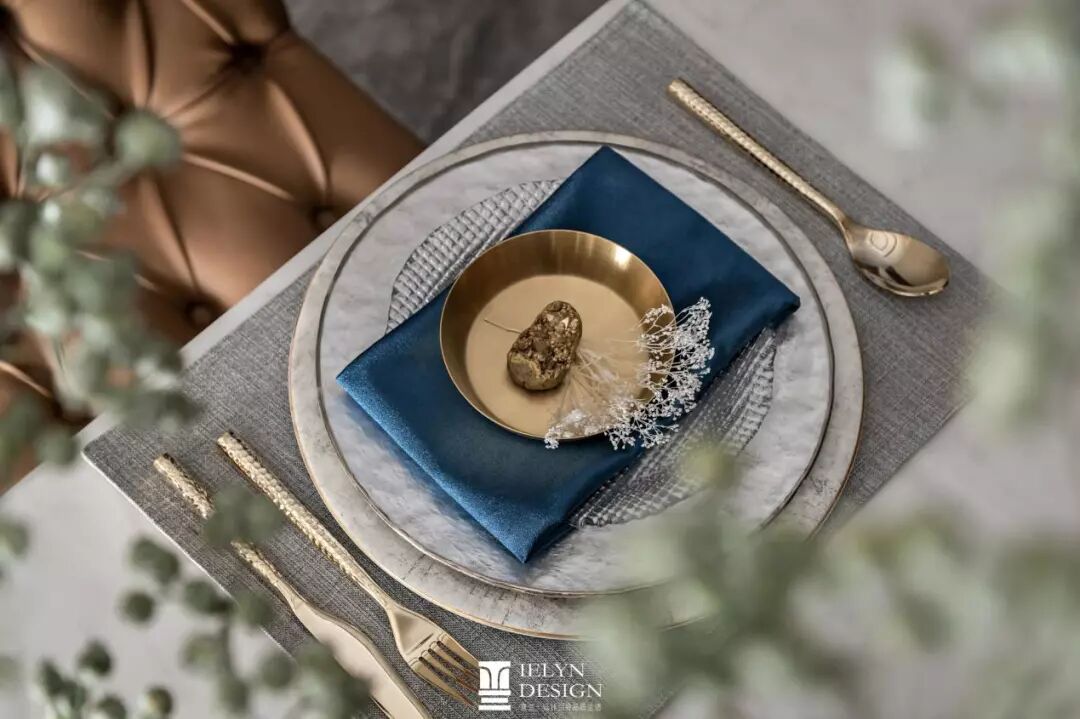 客厅余一张单椅露出暖意,如同晨光初现,而餐厅的色彩占比截然相反,IELYN以光色的辩证表现形/意和美,将画面里朦胧的阳光和微妙的水色引入空间,使得空间变得清新柔和,又伸几棵枝丫,生机盎然。