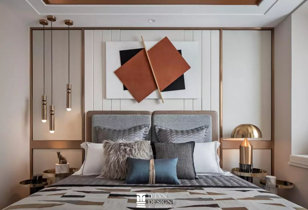细节与材质的磨合成就品质体验,转至卧室,缎面床品仍与光微妙互动,纯蓝与黄 茶色被压缩为色块,上与下的对立依然遵循日出意向,在这里暖意渐浓,酝酿清晨的徐徐朝气。