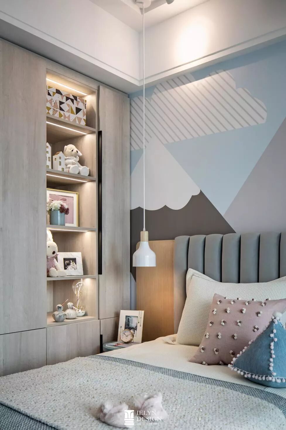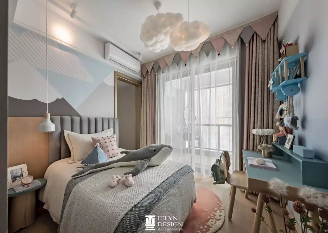 儿卧与主卧连通,便于业主照看孩子,同时也促进空间元素互动,日出意向化为纯粹的活力与明媚,海洋对鲨鱼,初阳对白云,抽象对具象,两个不同的空间既各有矜持,又诙谐统一,带来对亲子关系的贴心与美好祝愿。